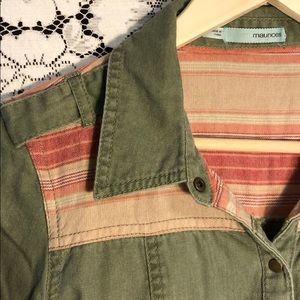 In excellent condition! This top is cute enough to be worn alone and functional enough to be worn as an over shirt/jacket. Snap button closures on front. Collared. Two front chest pockets. Button closure on sleeve cuffs. Smoke free home. 100% cotton and feels similar to a woven denim shirt or like a typical chambray shirt.