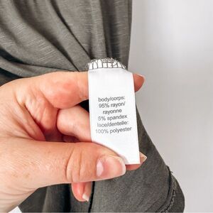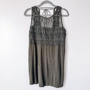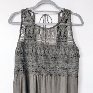 Details: Good gently worn condition, sleeveless, crochet lace overlay on the upper bodice and shoulders, soft flowy knit body, tie detail closure on the back