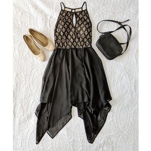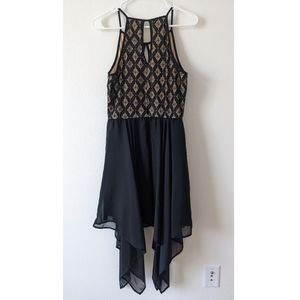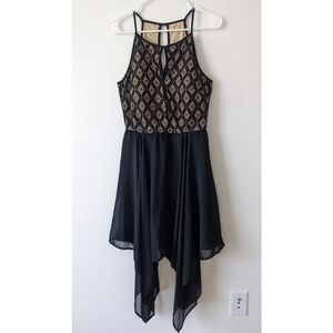 This dress is a halter top with a keyhole in both front and back. There is a very light built in bra in the front. The skirt is a lightweight handkerchief and is fully lined under the sheer part of the skirt.