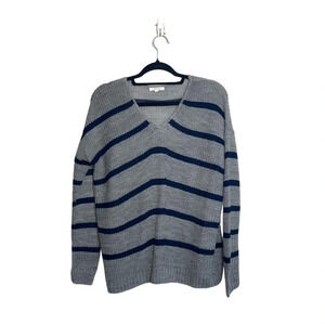 Maurices gray & navy blue striped pullover knit sweater. In excellent condition! V neckline. Long sleeves. Hip length. Tight knit material. Heather gray with navy blue stripes. Size small.