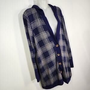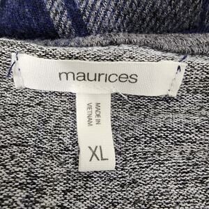 Maurices Hooded Cardigan Sweater Size XL Blue Gray Plaid Stretch V Neck Buttons