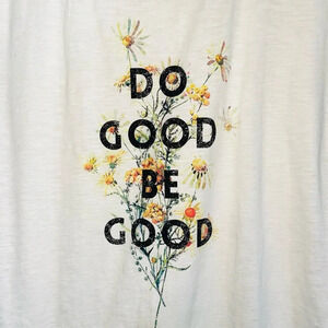 Maurices ivory white Do Good Be Good graphic tee. In excellent condition! Scoop neckline. Short cap sleeves. Round bottom hemline. Semi-sheer. Do Good Be Good on the front in black. Subtle yellow flowers behind the words. Creamy off white color. Size small.
