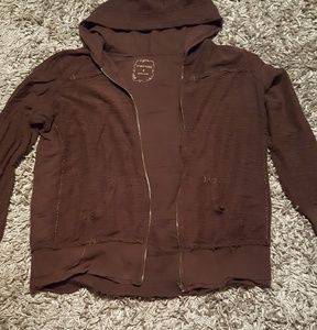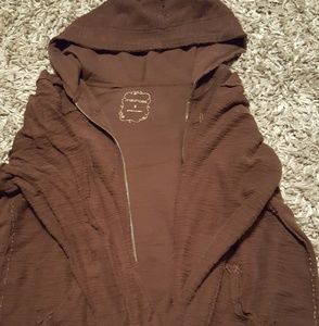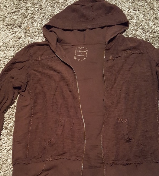 This is a lightly used brown hooded zip up jacket. It has the turned inside out look. It's the Maurices size 2 Thanks for looking