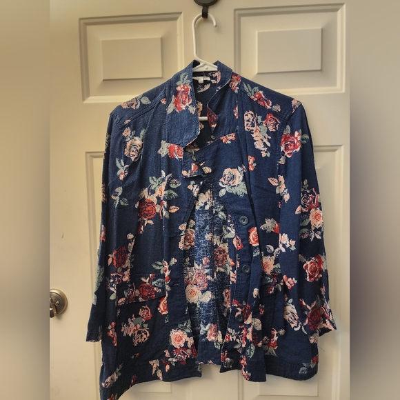 Navy blue floral print jacket with 4 buttons. pockets too