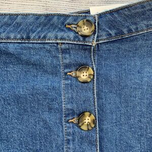 Denim skirt approx above knee length. Button front. Stretch. Medium wash.