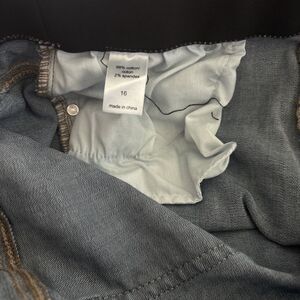 The product is a pair of Maurices Blue Jeans in a medium dark wash, jegging style with a comfortable waist for women in size 16. Made from a cotton blend denim material, these jeans feature a mid-rise fit with a 5-pocket design and a 24-inch inseam. The skinny style and stretch feature make them both fashionable and comfortable for everyday wear. Perfect for those looking for a versatile and flattering pair of jeans to add to their wardrobe.