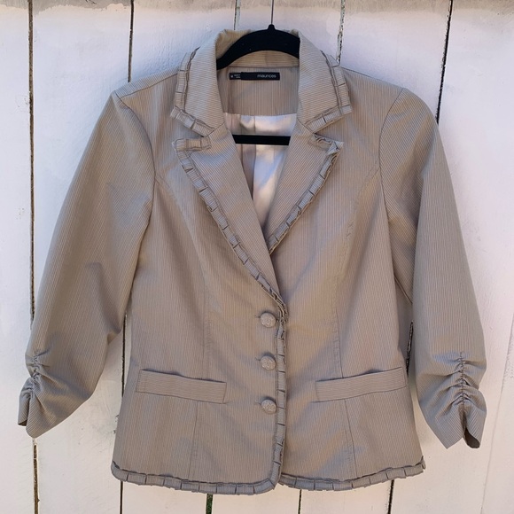 EUC khaki colored 3 button jacket with ruffled like edging. modified pinstripe. satin lined bodice. ruched sleeves. maurices medium. all tags, including spare button. buttons have floral design. SMOKE FREE HOME