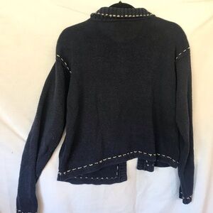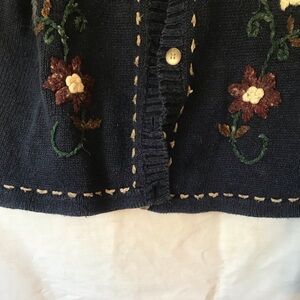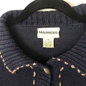 This Maurices Knit Cardigan Sweater with Floral Decor Size Medium is in very good condition and is Navy Blue.