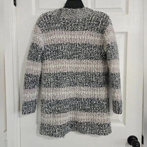 This is a Maurices brand loosely knitted cardigan sweater. Women's size small. Pink and white with black accented stripes. It's very fuzzy and soft with a comfortable lightweight style. It can be dressed up or down with the perfect outfit. Great for semi-casual, business-casual, professional, fall, winter, bohemian, city, etc. It's only been worn a few times and still in great condition.