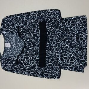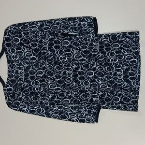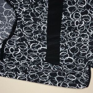 Feminine and flattering blouse with black ruffle trim, black front waistband and sleeve bands. Soft , comfy and flowy shirt made of 95% polyester, 5% spandex. Excellent Condition.