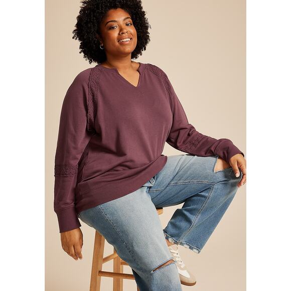 SEO-friendly keywords buyers search for: Maurices sweatshirt, lace detail sweatshirt, plus size pullover, women’s 2X top, casual lounge top