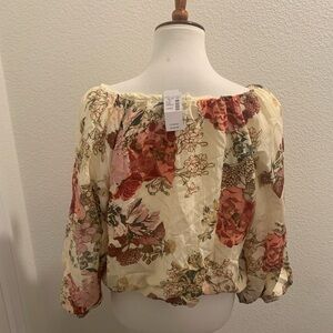 The sleeves are puffy with a tin band of elastic around the bottom. The ballon waist also has a thin band of elastic around it. This is just SO pretty! It's fully lined and has 3/4" sleeves.