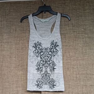 Chic light gray tank top with elegant black design. Ideal for casual wear. 26" long 19" pit to pit