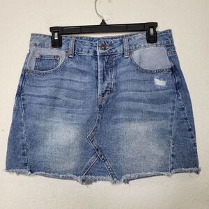 Maurices Light Wash Blue Denim Raw Hem Button Fly Mini Jean Skirt Size 3/4