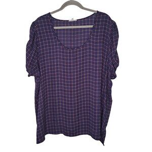 Lightweight blue plaid blouse from Maurices. You may need to wear something underneath this. The sleeves have elastic/scrunching along the tops. Plus size 2X; measures about 27.5 inches between the pits, 28 inches long.