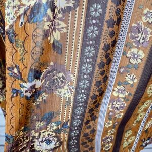 This blouse is full of boho charm. The colors are tones of golden rod with maroon and neutral tones mixed in, creating a charming floral pattern. It has a smocked neckline. Made of lightweight rayon material. Keyhole in the back
