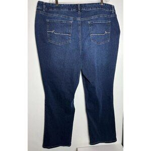 These are Maurice's M Jeans for women in size 24W. They feature a straight style with a mid-rise waist of 44 inches. The jeans come in a blue color and are made of polyester, spandex, and cotton denim fabric. They have a zip and button closure, with a 31-inch inseam. These plus-size jeans are machine washable and are branded by Maurice's.