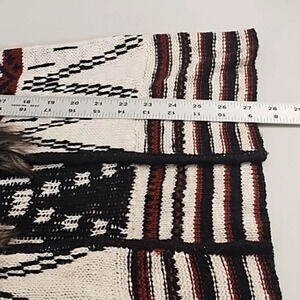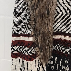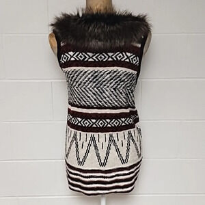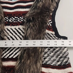 Maurices Med Fair Isle Open Front Fur Collar Vest Burgundy Black Cream