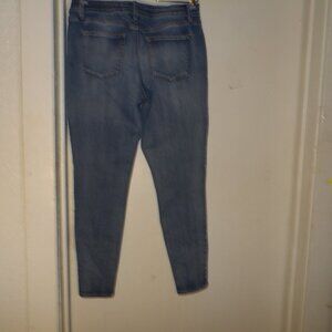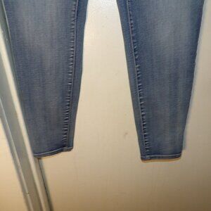 lighter blue wash , 4 pocket style with belt loops , material is 78% Cotton 20% Polyester 2% Spandex , skinny leg , Sz Large Regular rise measures 9.5" Inseam measures 28" Waist Lying flat measures 16.5" , good used condition no issues shows minor washing wear. Pet friendly non smoking home