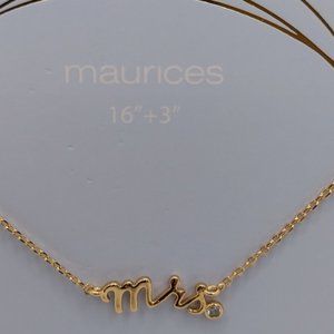 Maurices "Mrs" necklace - NWT. It hasn't been removed the packaging. This is a dainty gold (not real) necklace with "mrs" in the middle. Would be great to wear after the wedding!