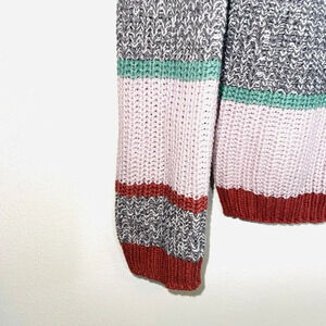 Maurices multicolor striped henley knit pullover sweater. In excellent condition! V neckline. Large brown buttons on the neck. Long sleeves. Straight bottom hemline. Thick tight knitting. Heather gray, white, turquoise, light purple & salmon pink stripes. Size small.