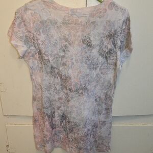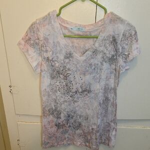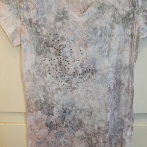 Looking for a great top? Check out this stylish, gently used women's size large Maurices v-neck t-shirt. This top features a beautiful floral and leaf pattern in soft shades of pink and gray on a white background. The front is decorated with a sparkling rhinestone heart design at the chest, adding a touch of unique flair.