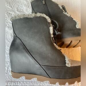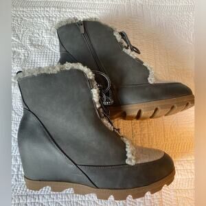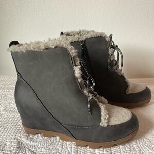 Maurices NWOT Women's 12 Neutral Camille Gray Sherpa Trim Lace Up Wedge Boot