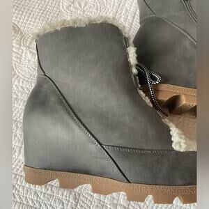 Maurices NWOT Neutral Camille Gray Sherpa Trim Lace Up Wedge Boot Size 12
