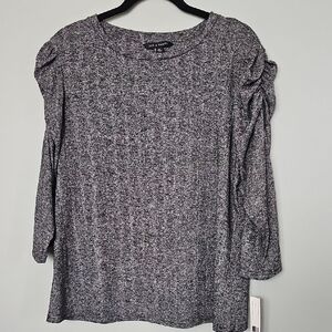 Gray color. Does stretch. Thick strip of ribbed fabric at the bottom. 3/4 length sleeves. Is on the smaller side of large in my opinion, please see measurements. It would stretch. Office, workplace, neutral, topper, modest, business, professional, basic, simple, plain, solid color, dinner, church, brunch, fitted