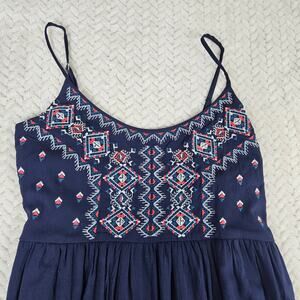 Stylish navy blue midi dress. Features intricate embroidery on the bodice. Spaghetti straps for a chic look.