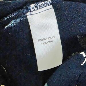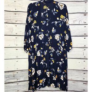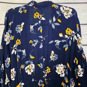 Maurices women’s navy floral kimono, size 0/1. Lightweight 100% rayon, made in India. Features a navy background with yellow, white, and gray floral print, open front, and 3/4 sleeves. Effortless layering piece for casual or dressy looks.