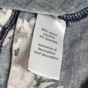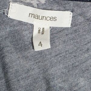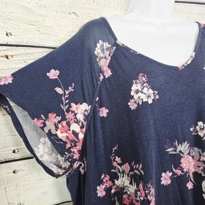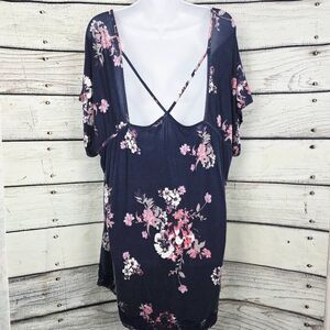 Maurices women’s short sleeve top, size 4 (XL equivalent). Navy blue with light pink and white floral print, crisscross back detail, and lace-trim hem. 96% rayon, 4% spandex. Stretchy and flattering fit. Made in China.