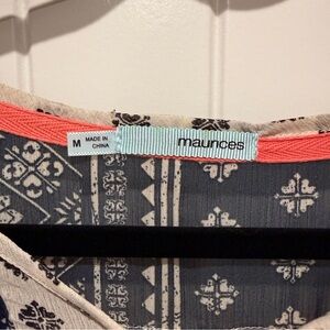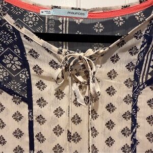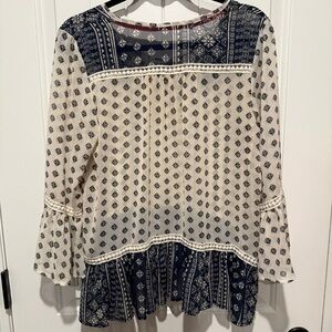 Chic boho blouse with navy and cream patterns. Features a tie neckline and flared sleeves.