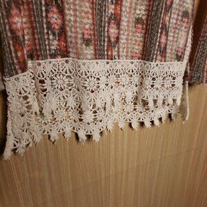 Maurices women’s new soft, thin open knit aztec long sleeve tunic sweater small. New condition. Measurements are: 25” sleeve, 26” from shoulder to shortest part of hem, and 18 ½" from armpit to armpit.
