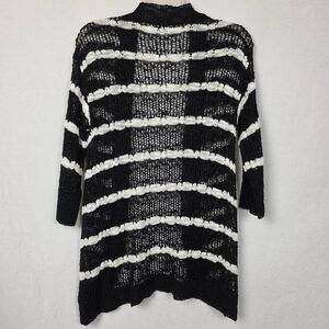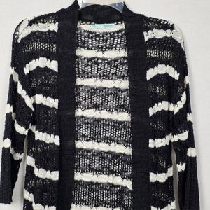 Maurices open-knit long cardigan in black and white stripe. Lightweight, airy texture with 3/4 sleeves and a draped open front. Easy layering piece for casual outfits or office looks. Semi-sheer knit adds dimension without bulk. Size S.