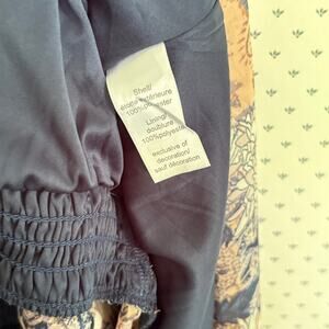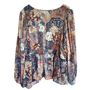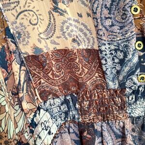 Maurices Patchwork Peasant Blouse. Flowy bell sleeves. Smocked waist with ruffle peplum hem. Button detail at V neck. Lined. Pristine condition. Size 2X.
