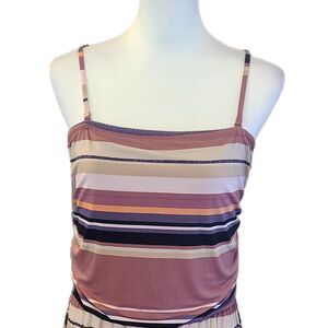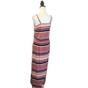 Details: Pink, purple, orange, beige vertical stripes, pull-on maxi style, detachable straps, side ruching, hi-low hemline, lightweight stretch fabric