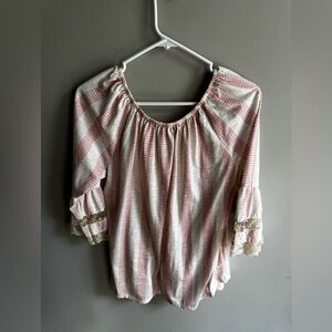 Stylish pink and cream striped blouse with tassel ties. Features ruffled sleeves for a feminine touch.