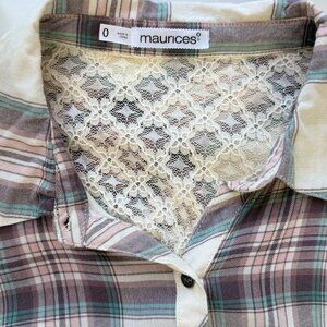 Maurices Plaid Button Long Sleeve Shirt w/ Lace Detail 100% Rayon Womens Size 0