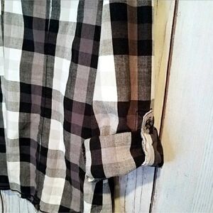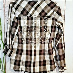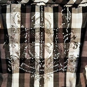 Maurices Plaid Rhinestone Embellished Down Shirt Black & White.