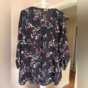 This is a gorgeous blouse with a button detail on the sleeves. Beautiful flower pattern. This top can easily be worn casual with jeans or business casual with dress pants to go to work. Size XL. Great condition and without any flaws.