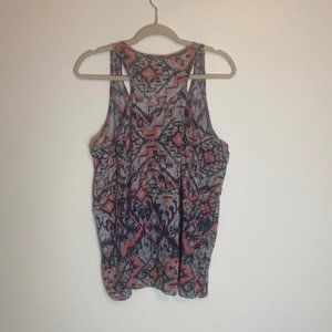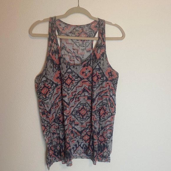 Aztec pattern razorback tank top with coral, navy blue and gray colors. Item#0101