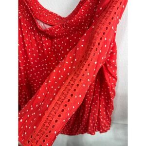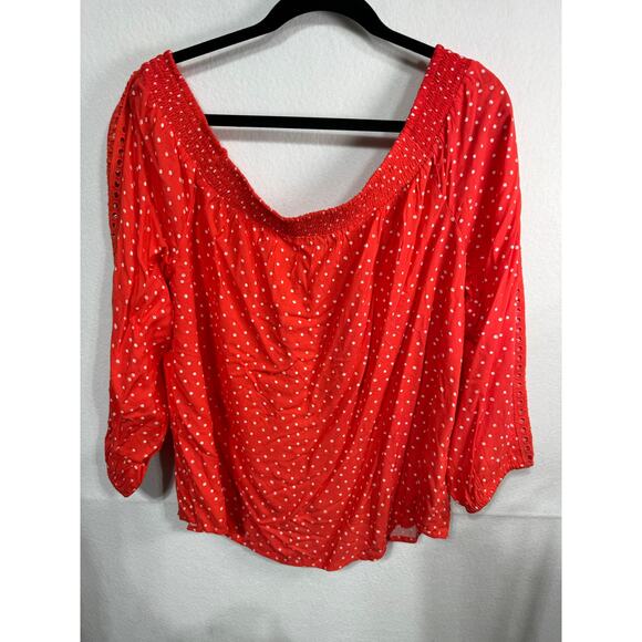 Maurices red and white polka dot peasant blouse featuring an off-shoulder neckline with smocked detailing and 3/4 length sleeves with eyelet accents. Lightweight and flowy, perfect for casual or dressy looks. Chest measures 19 inches with a 24.5-inch length. Brand new. Plus size 1X.