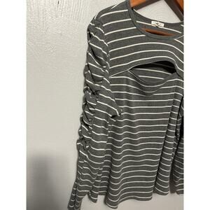 Maurices Ribbed Top Gray White Striped Cutout Peekaboo Ruched Long Sleeve