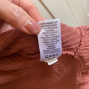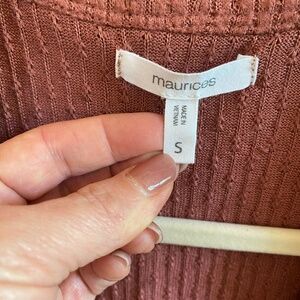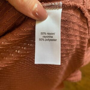 Features: Open front, long sleeves, textured knit, rounded ruffle raw edge hem. Burnt orange.