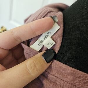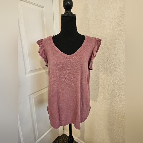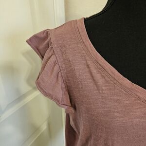 This relaxed t-shirt from Maurices features a delightfulf pinkish color complemented by charming ruffled sleeves. Its lightweight fabric and scoop neckline ensure comfort and style, making it perfect for casual outings.