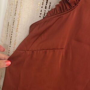 Chic ruffled cap sleeve blouse. Rich rust/burnt orange color. Ideal for versatile styling. Sorry for the wrinkles 😬 Great fall blouse (I live in the south and It's hotter'n blue blaze in the fall)! Looks great paired with the brown crop jeans I have posted!