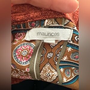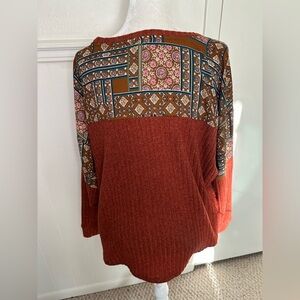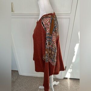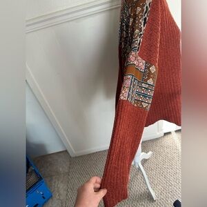 EUC. No flaws. This stylish rust sweater by Maurice has colorful patterned sleeves. It's ideal for a chic look or Boho style. It's size 0, but it fits like a small-medium.