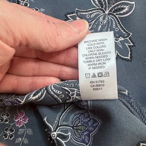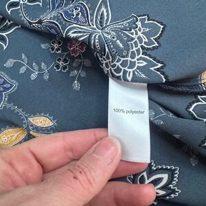 Maurices women’s floral blouse in a deep blue with multicolor paisley-floral print. Lightweight, slightly sheer polyester with a flowy drape. 3/4 sleeves with gentle gathering, rounded hem, and easy tunic-style fit.