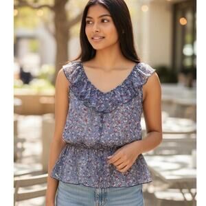 Gently used Maurices sheer button-up top in size Large, featuring a flattering peplum hem and a charming floral print in cornflower blue — perfect for spring and summer. This feminine, sleeveless top includes a neck ruffle, elastic waist for a comfortable fit, and button-front closure. Ideal for casual outings, festivals, cottagecore styling, or “coastal grandma” looks. Approximate flat-lay measurements: pit to pit 19”, length 28.5”, waist 15” unstretched. Soft, lightweight fabric ensures comfort and breathability.
